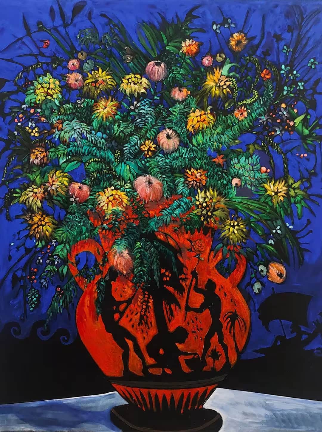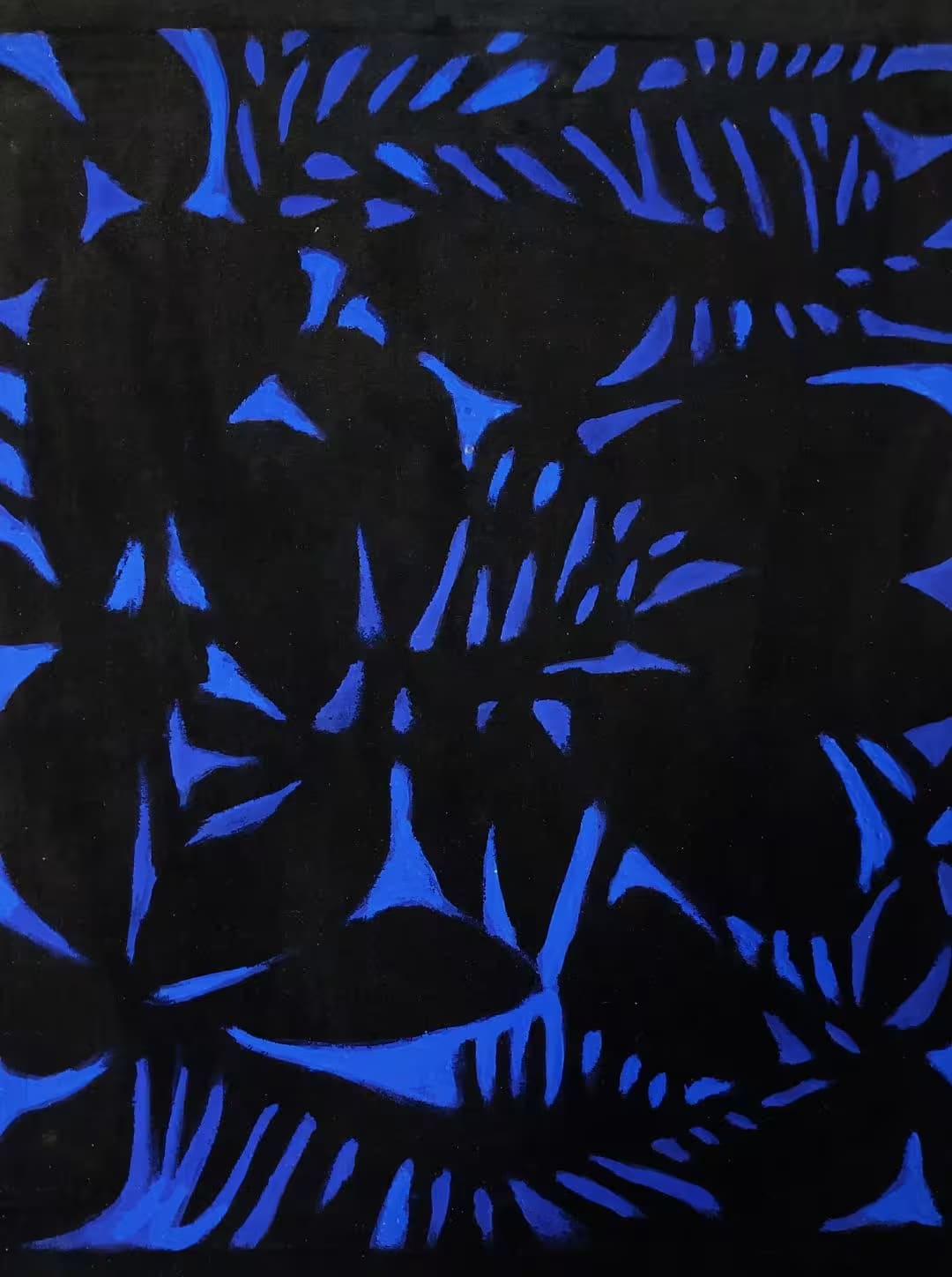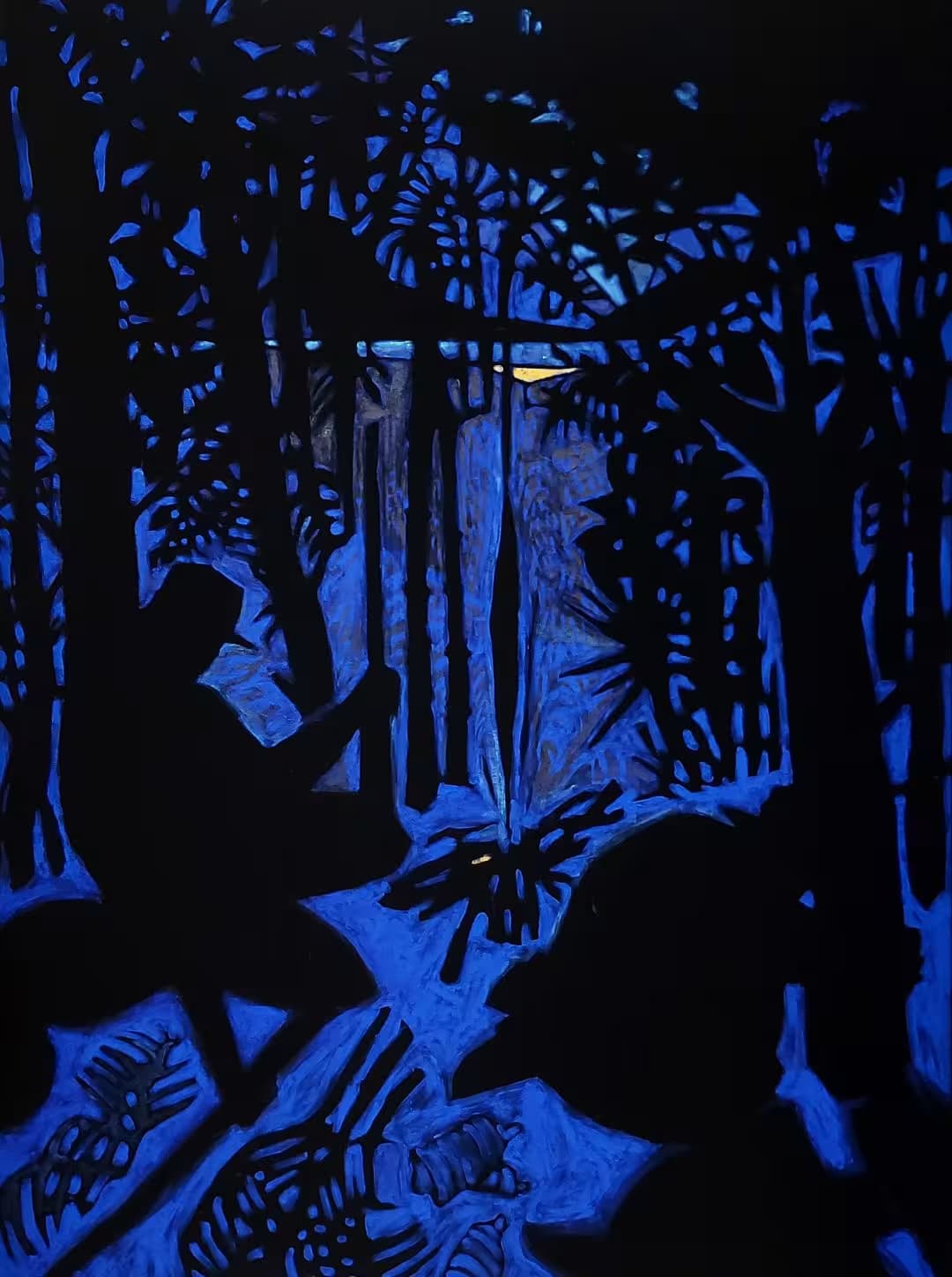 Los temas u objetos se pintan en negativo con pigmento azul ultramar. La figura se deja entonces en “blanco” (en terciopelo negro) y se define por los contornos. Esta técnica proporciona una sensación singular de luz nocturna, de claro de luna.